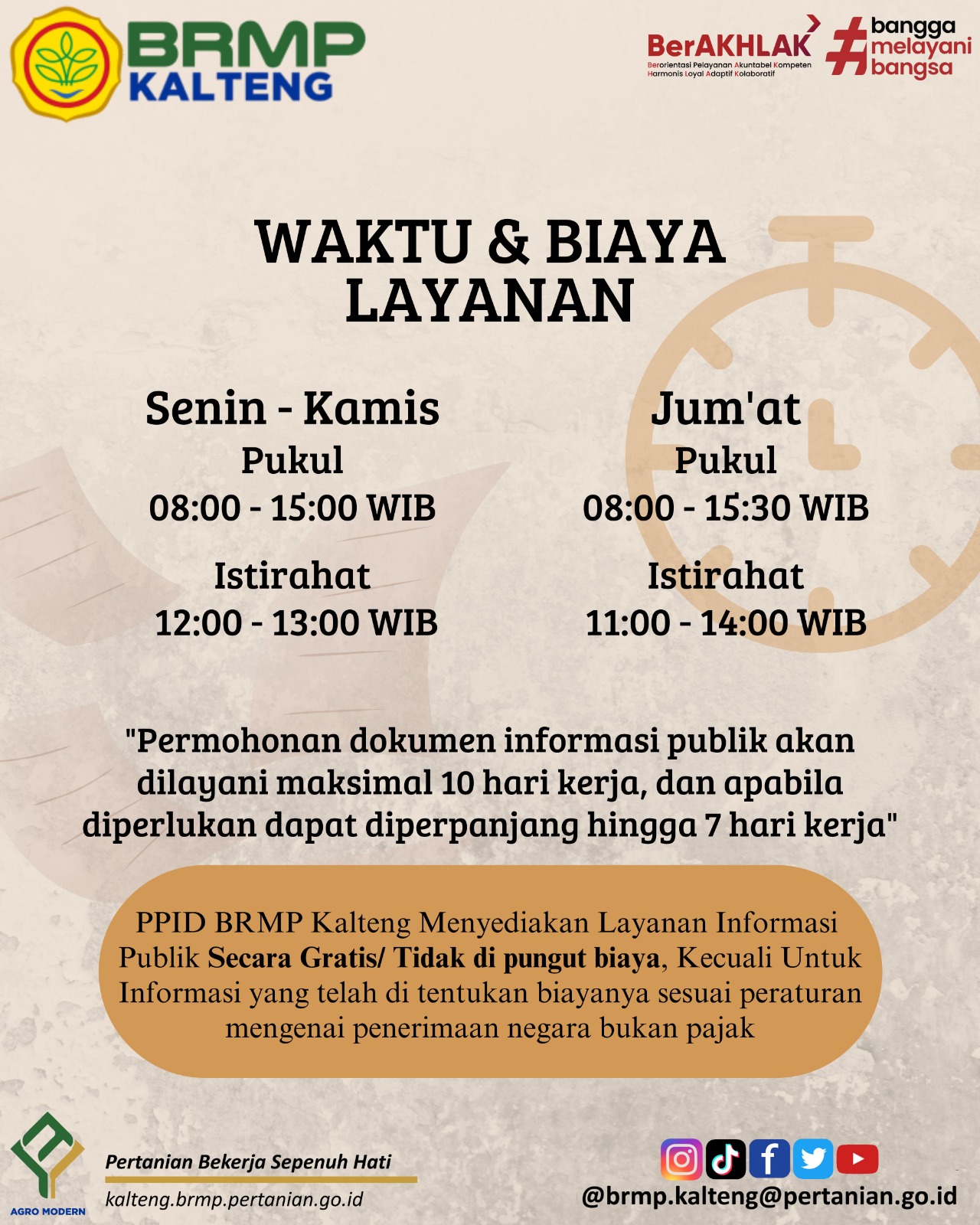 PPID Balai Penerapan Modernisasi Pertanian (BRMP) Kalimantan Tengah menyediakan layanan informasi publik secara gratis (tidak dipungut biaya), kecuali untuk informasi yang telah ditentukan biaya Penerimaan Negara Bukan Pajak (PNBP). Sedangkan untuk penggandaan atau perekaman, pengguna layanan informasi publik dapat melakukan penggandaan sendiri di tempat penyediaan jasa fotocopy yang berada di sekitar gedung Kantor BRMP didampingi oleh petugas layanan informasi atau yang bersangkutan menyiapkan media perekam elektronik. Pelayanan informasi publik akan diproses oleh petugas selama maksimal 10 hari kerja, dan dapat ditambah hingga 7 hari kerja apabila diperlukan.