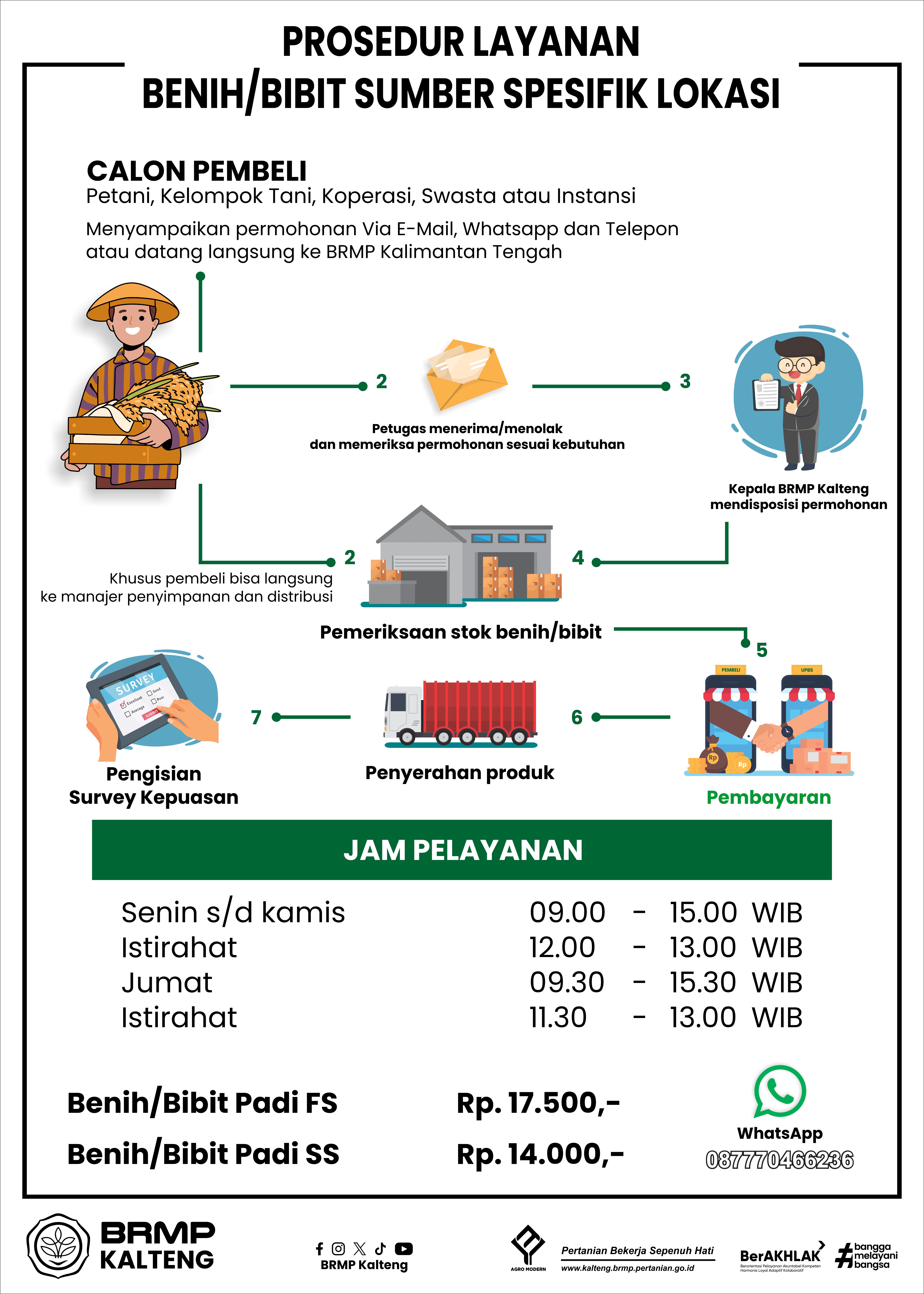 - Pengguna layanan mengajukan surat permohonan bantuan benih/bibit komoditas tanaman pangan/ hortikultura/ perkebunan/ peternakan kepada pejabat berwenang dalam hal ini Kepala BRMP Kalimantan Tengah,