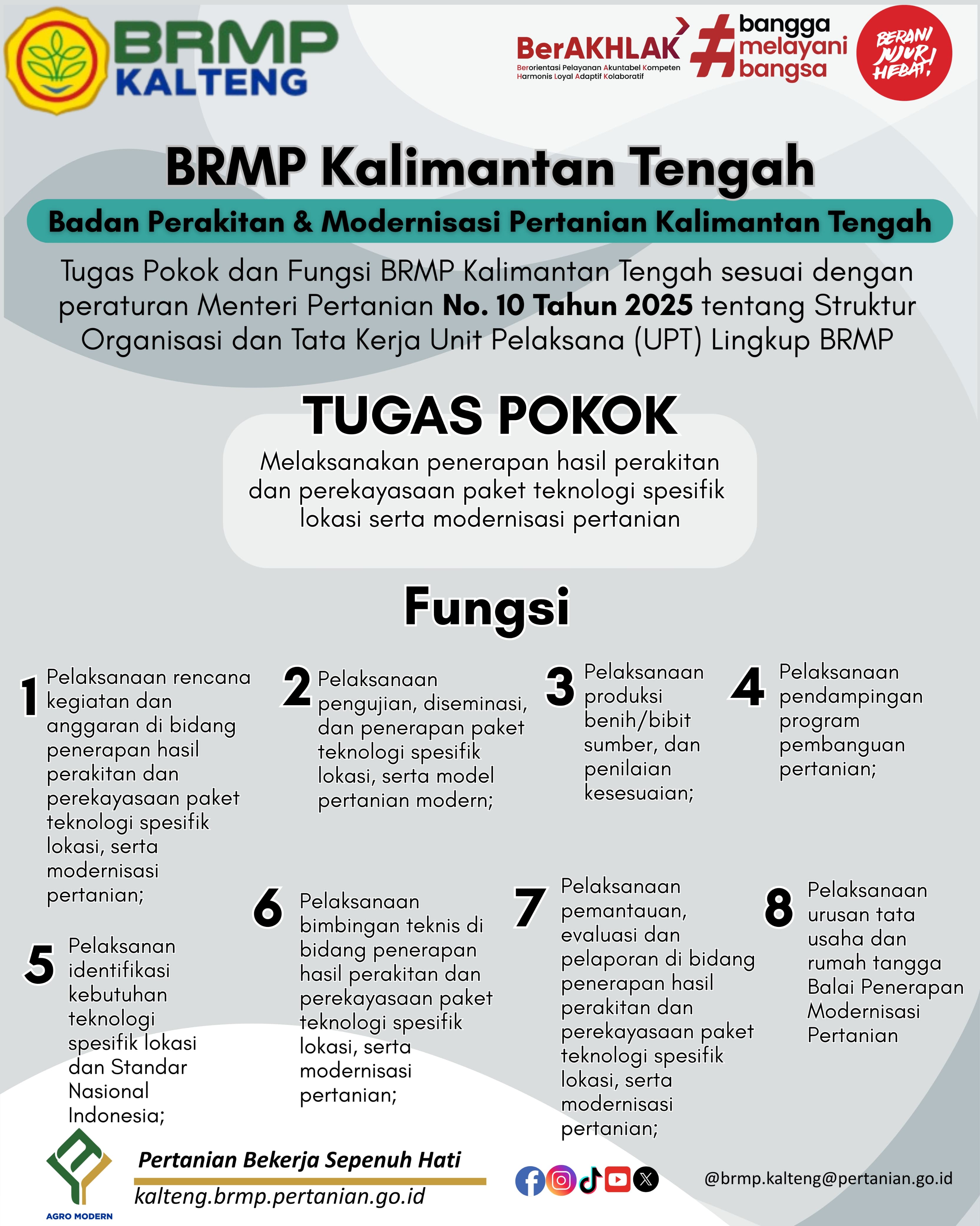 Adapun tugas Badan Perakitan dan Modernisasi Pertanian (BRMP) adalah melaksanakan koordinasi, perumusan, penerapan, pemeliharaan, dan harmonisasi standar instrumen pertanian. Untuk mendukung tugas dan fungsi BRMP, maka berdasarkan Peraturan Menteri Pertanian Nomor 10 Tahun 2025 telah dibentuk Balai Penerapan Modernisasi Pertanian. Dalam penyebutan sehari-hari juga dikenal dengan nama BRMP Kalimantan Tengah.